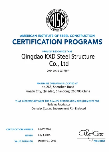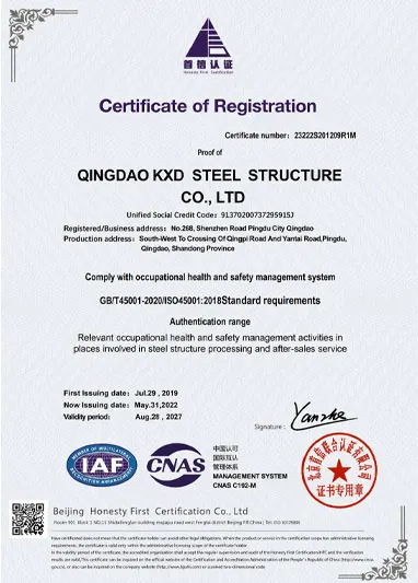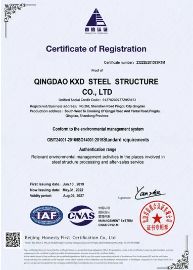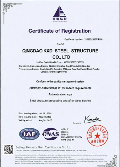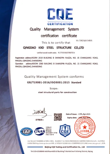 To ensure impeccable products and services for our clients worldwide, KXD has obtained the following internationally recognized certifications: CE (EN1090), ISO 9001, ISO 14001, ISO 45001, and WPQR. These certifications validate our rigorous quality management system and confirm that every steel structure we deliver meets the highest international standards.